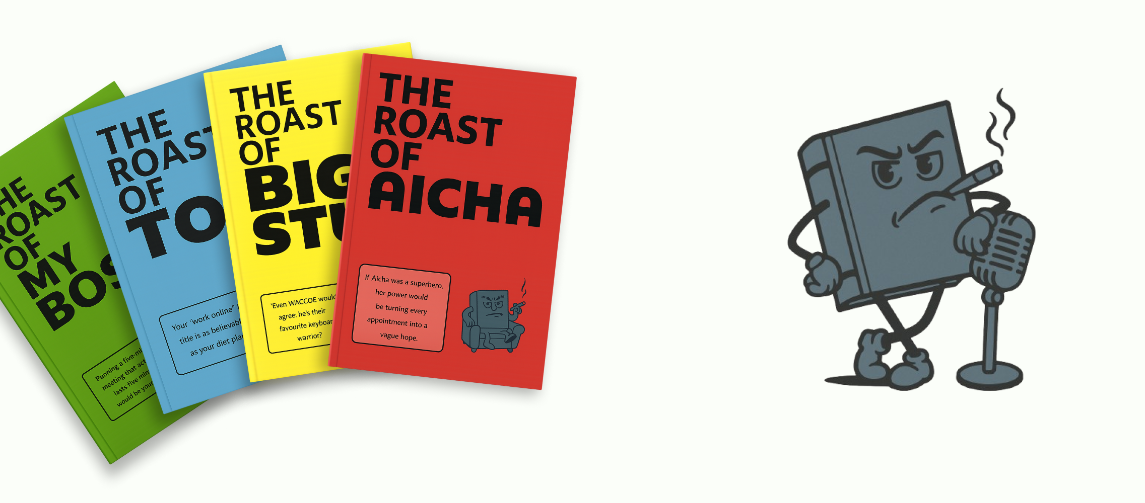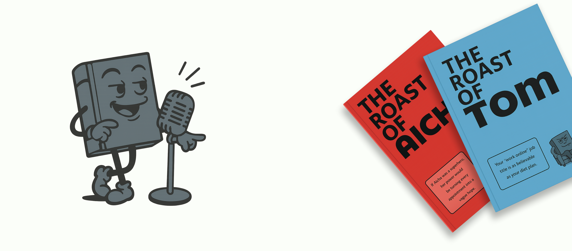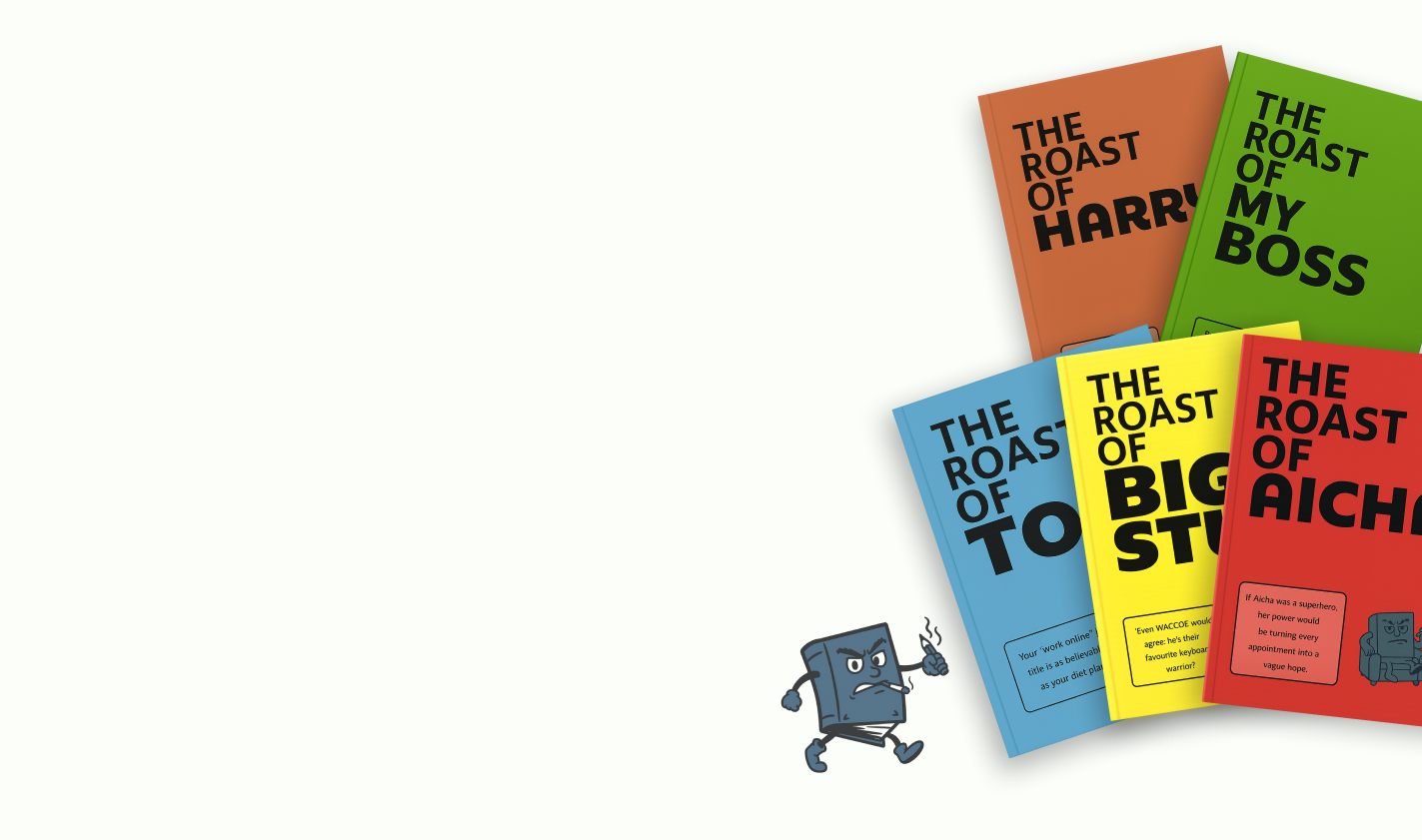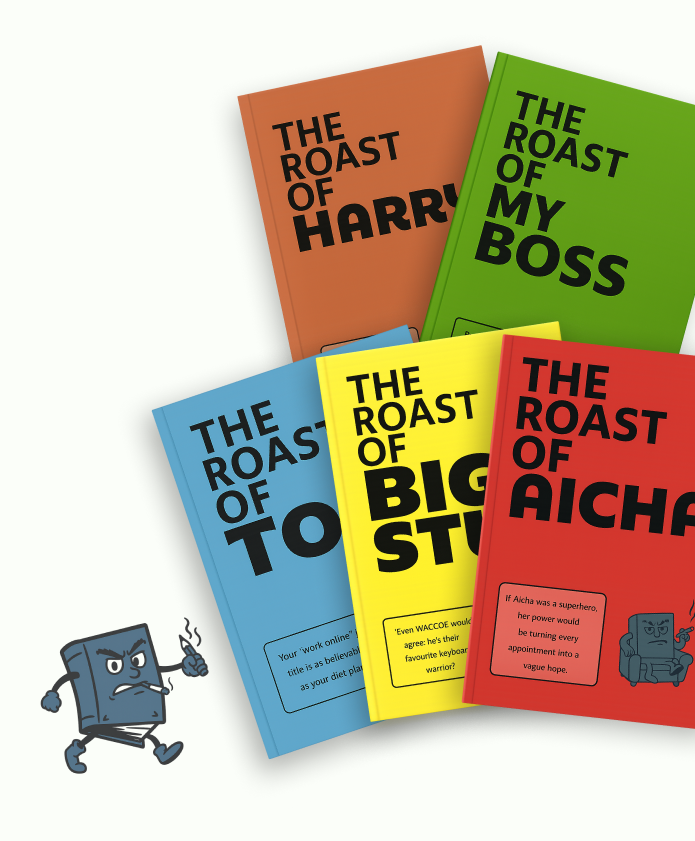 Every book is created, reviewed, edited, and perfected by our savage human writing team to make sure the humour hits, the tone lands, and the roast is actually funny (not just robotic nonsense).